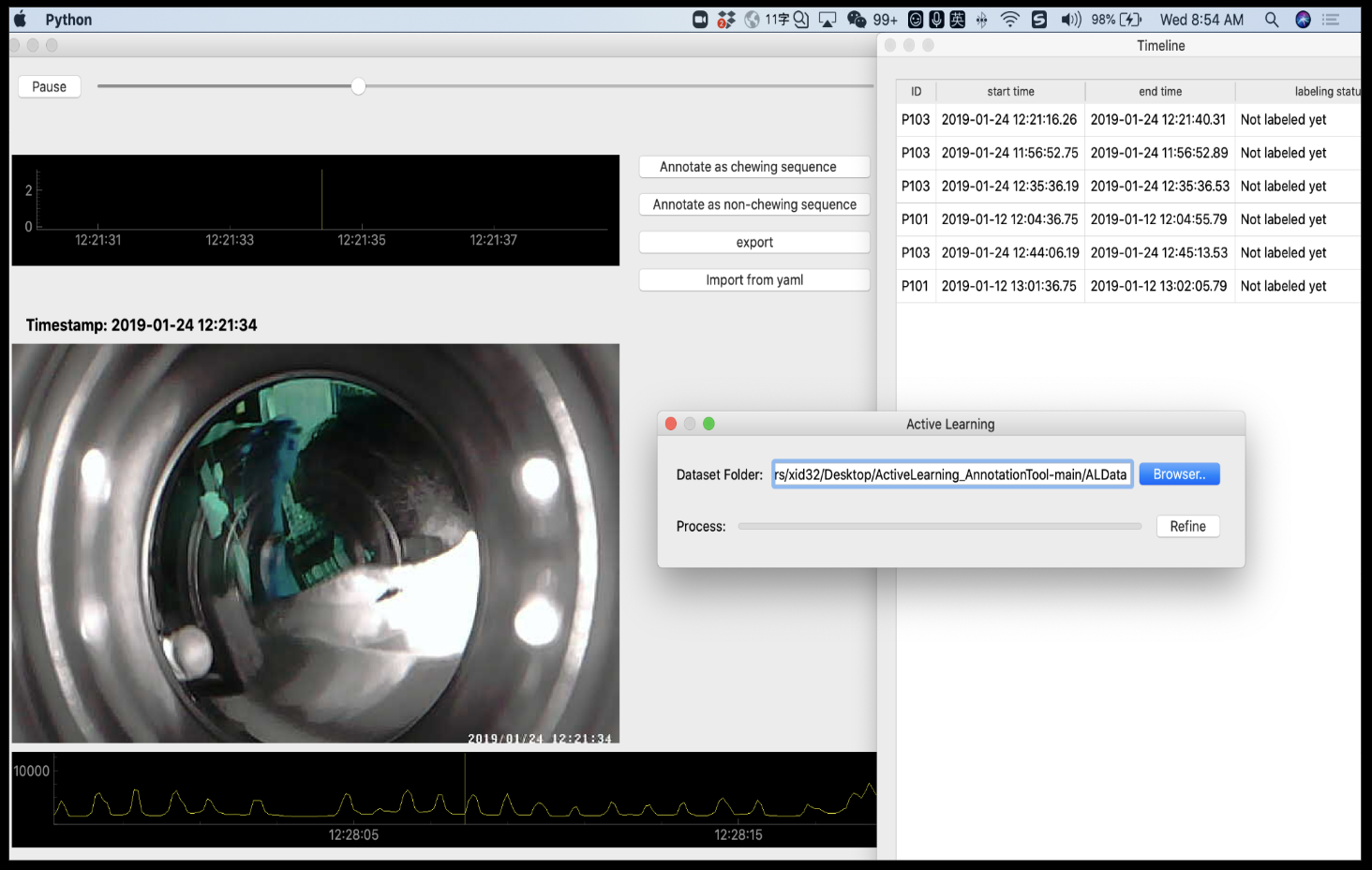 An interactive annotation software that utilizes active learning to reduce data labeling time and cost. The front-end was created with PyQt5 and pyqtgraph, offering features such as time synchronization and video frame-by-frame rewinding. The back-end, utilizing cv2, sklearn and xgboost, performed data processing, K-means clustering, and clustered entropy active learning. |