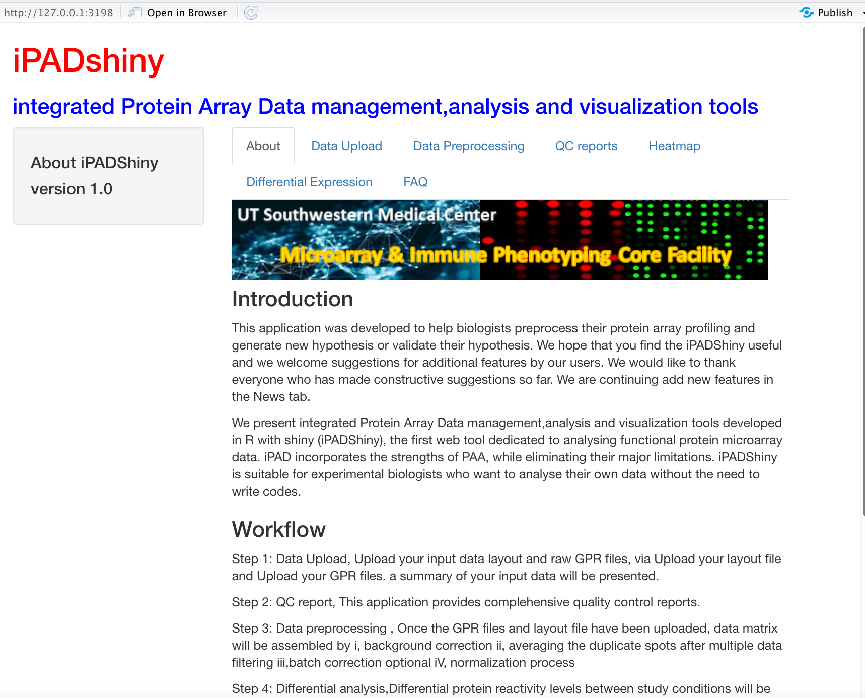 iPADshiny (integrated Protein Array Data management,analysis and visualization tools) is a desktop application that simplifies protein analysis for biologists. It integrates multiple algorithms, including the auto-antibody Profiling Analysis, and utilizes state-of-the-art computational methods for efficient and effective analysis. |